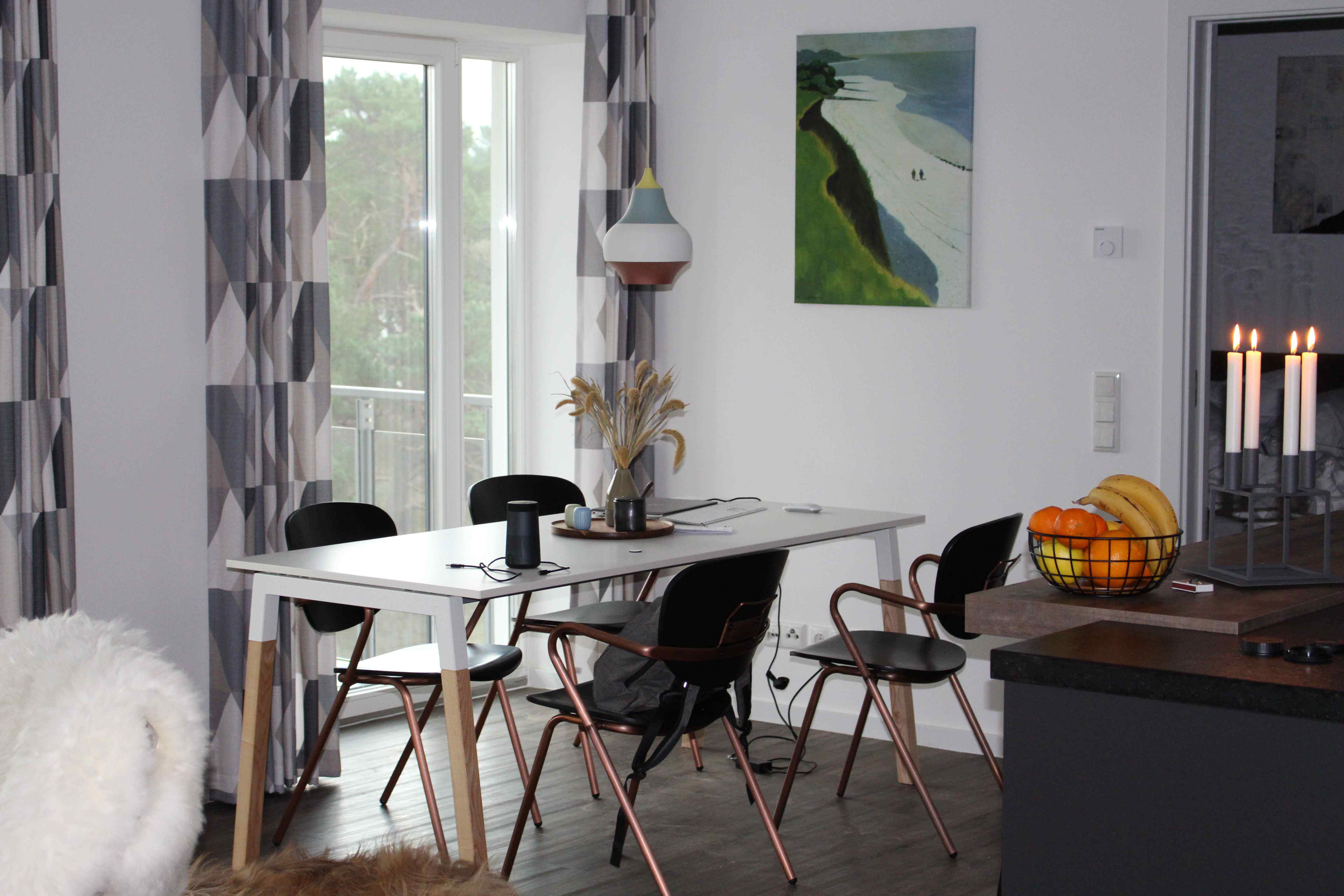 Sofa, Sitzbereich, Essbereich, Flach-TV, Balkonzugang
